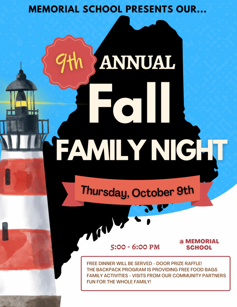 9th Annual Family Fall Night is October 9th! By wpadmin|2025-10-07T11:12:20-04:00October 7th, 2025|Memorial School News|Comments Off on 9th Annual Family Fall Night is October 9th! Share This Story, Choose Your Platform! FacebookXLinkedInPinterestEmail