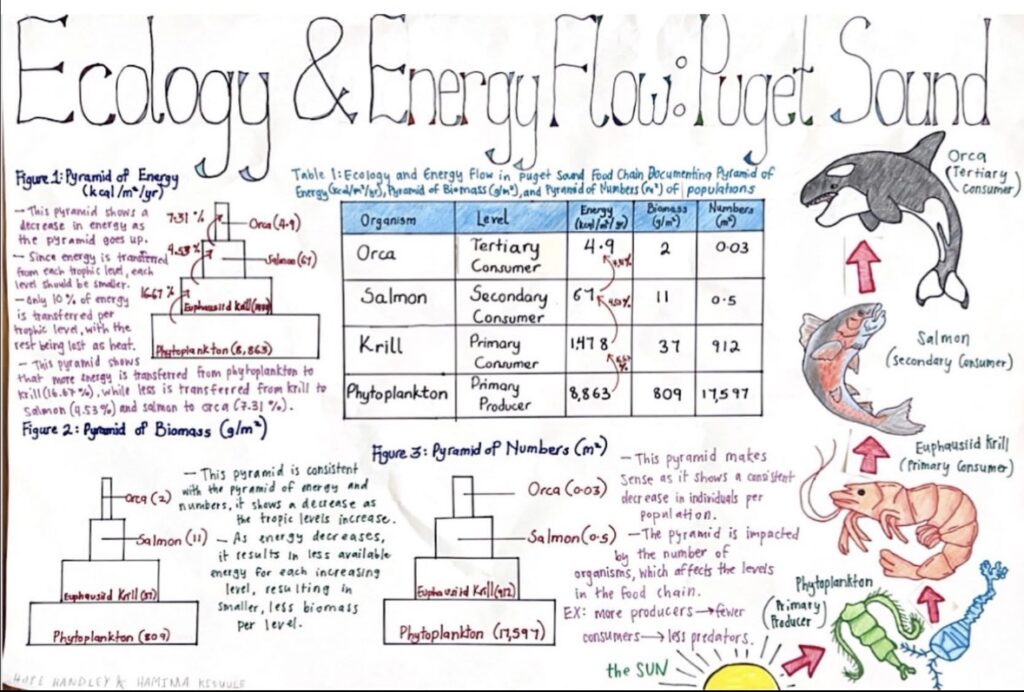 The International Baccalaureate (IB) Biology seniors at GNG High School have been diving into their Ecology Unit by analyzing real-world data from Puget Sound. As part of the project, students created posters illustrating ecological pyramids and food chains. This work gave them the chance to combine scientific analysis with artistic expression, showing that learning can be both creative and rigorous.