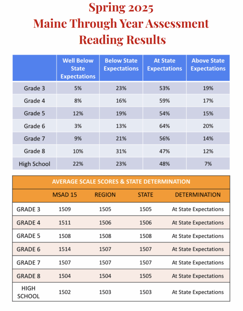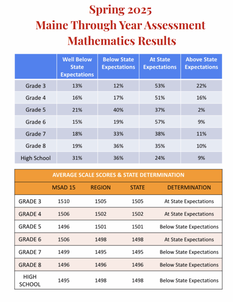 MSAD 15 provides academic data annually to supplement data available from the Maine Department of Education (MDOE) in their ESSA School Data Dashboard, which includes teacher, academic, attendance, and other data for all Maine public schools and school districts.