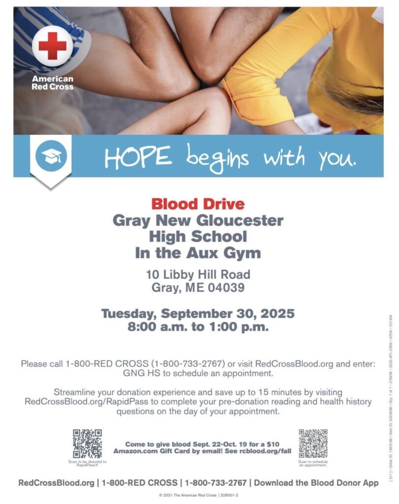 Gray-New Gloucester High School will be hosting a Red Cross Blood Drive in the Aux Gym on: